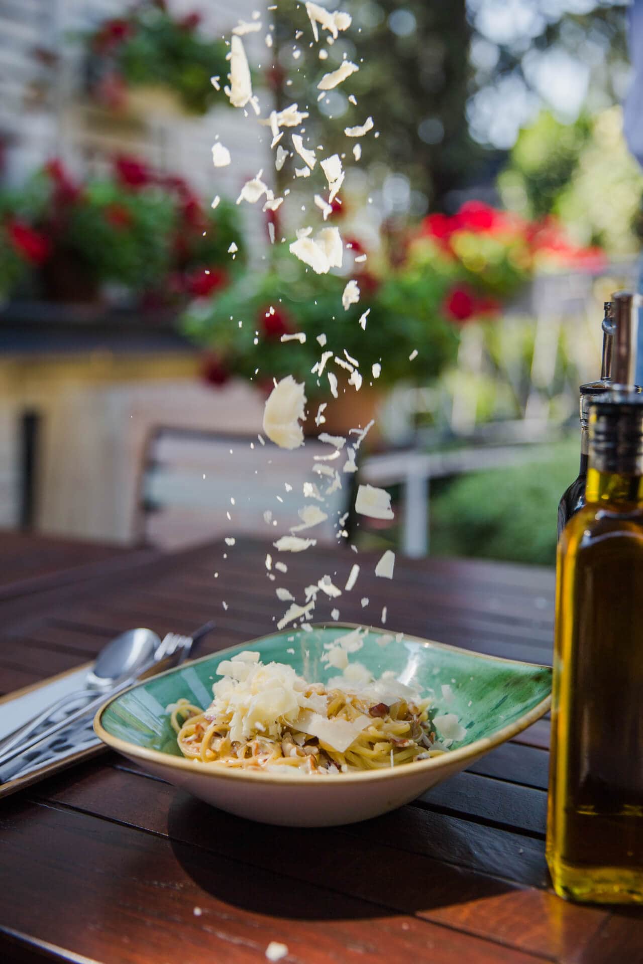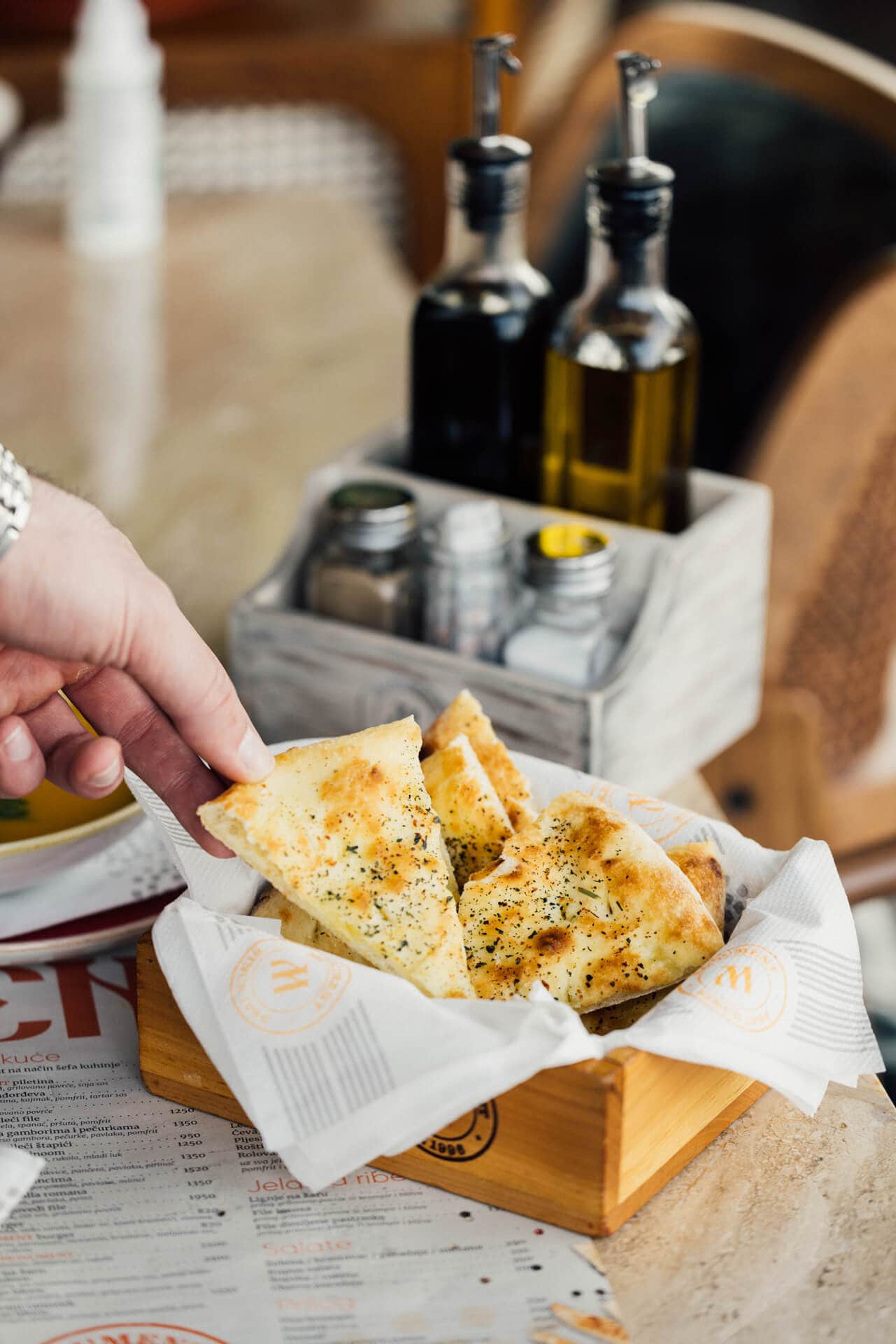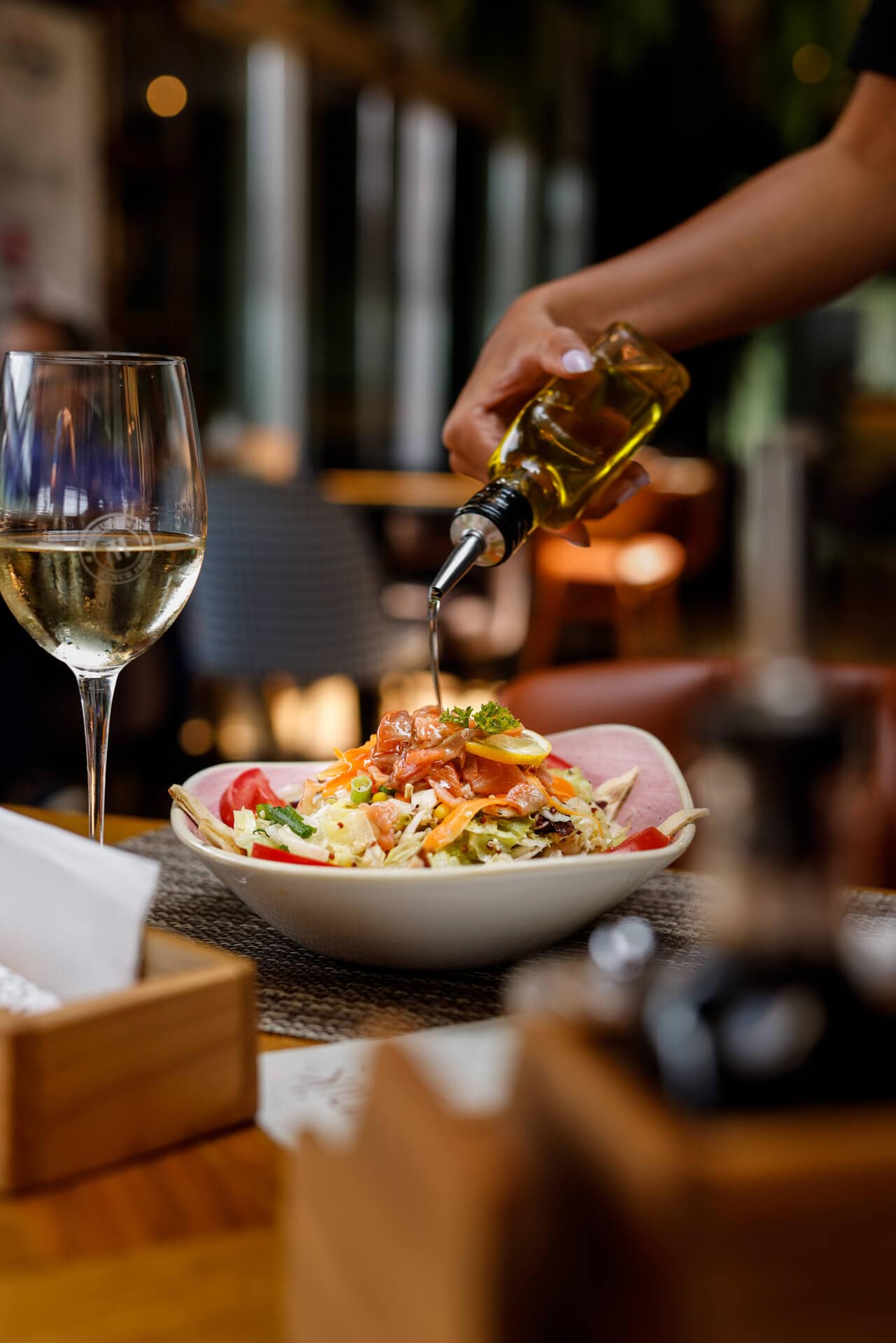 Restoranski deo zasniva se na izvornoj mediteranskoj kuhinji. Upotrebom isključivo prirodnih namirnica i začina, te njihovom brzom termičkom obradom dobijamo jela sa bogatim sastavom minerala i vitamina čija se aroma pamti. Kroz koncept zdrave ishrane u našem jelovniku izdvajamo veliki izbor salata, koje po svojoj energetskoj vrednosti i gramaturi, kao i atraktivnoj recepturi, predstavljaju savršen spoj za idealan obrok.